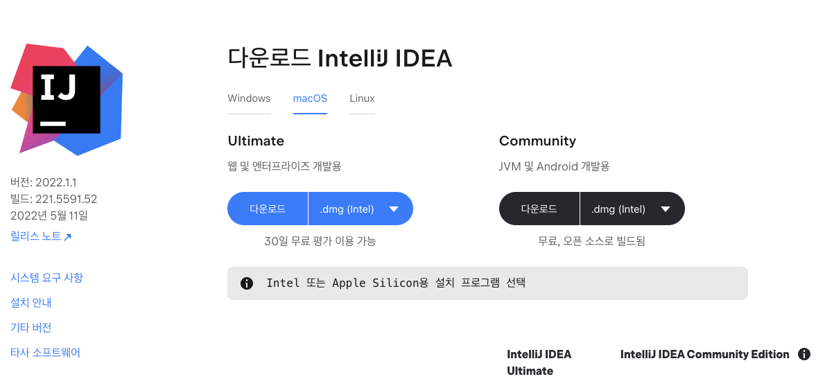 저는 현재 M1맥북에어를 사용 중이어서 애플 실리콘 버전으로 설치하겠습니다